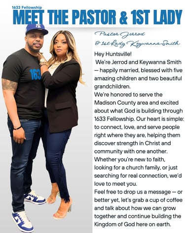 Our mission at 1633 Fellowship is to raise a generation of overcomers who fight the good fight of faith with peace in their hearts, courage in their spirit, and victory in their walk. We exist to help people find strength in Christ, stand firm in trials, and walk boldly in the power of the One who has already overcome the world. — Inspired by John 16:33